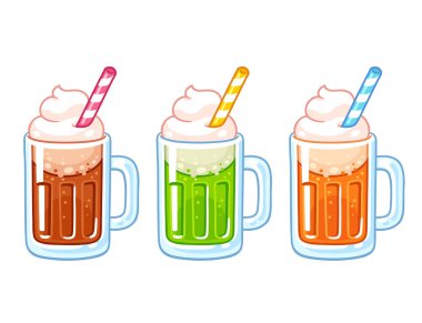 A cute happy root beer float cartoon character with a red and white striped straw ready for a sweet dessert cute cartoon root beer float illustration.